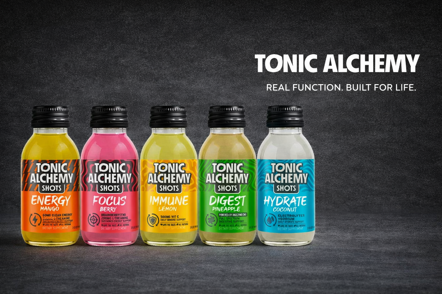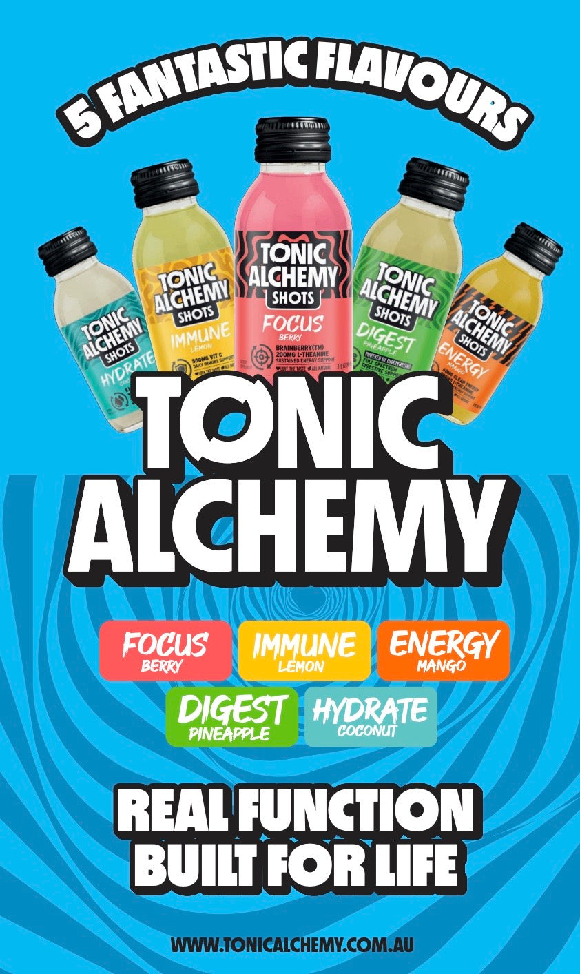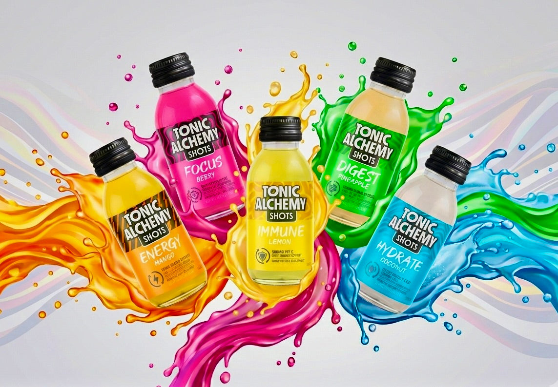 The Tonic Alchemy Mixed Box of 12 is designed to introduce you to our complete functional ecosystem — targeted support across immunity, digestion, energy, cognitive performance and hydration.
