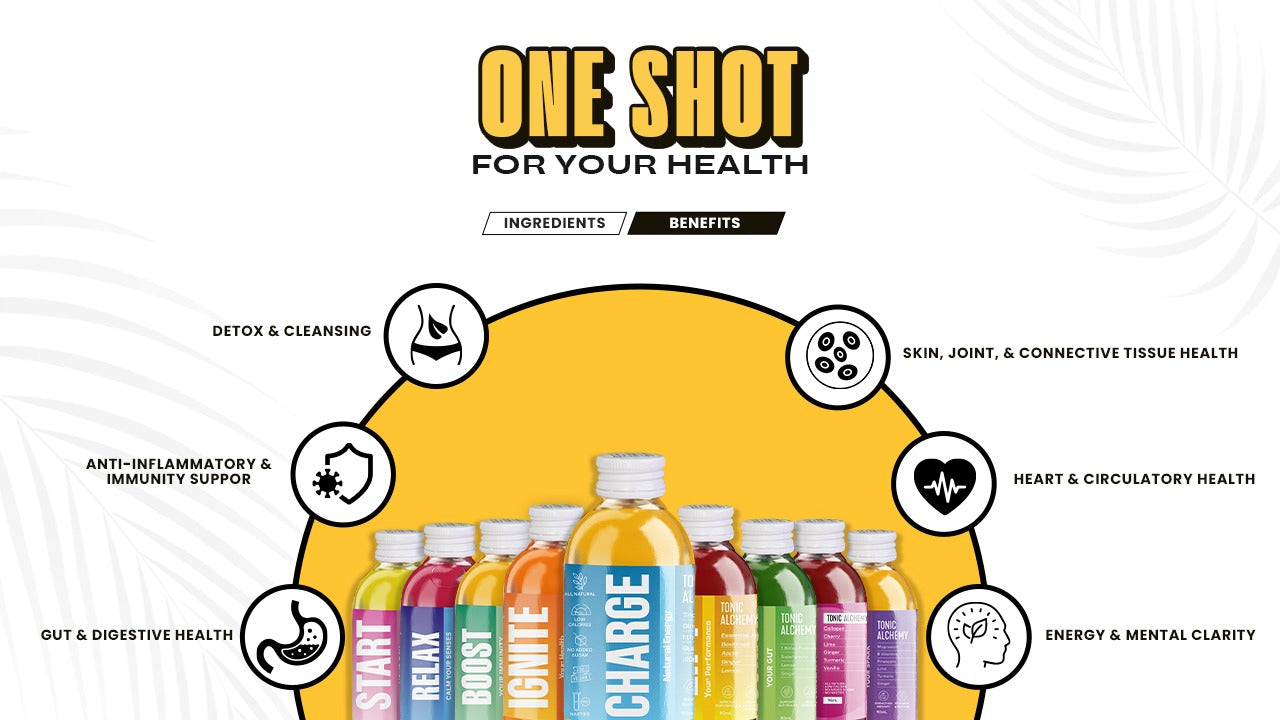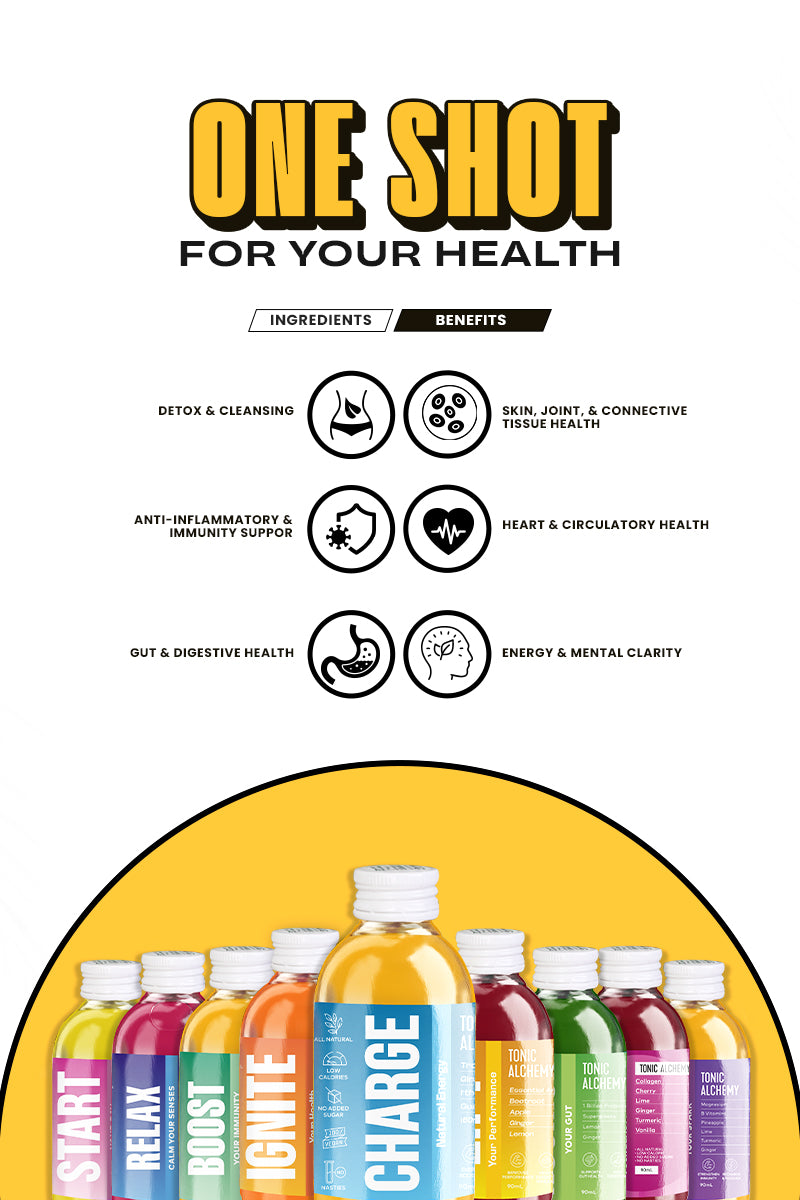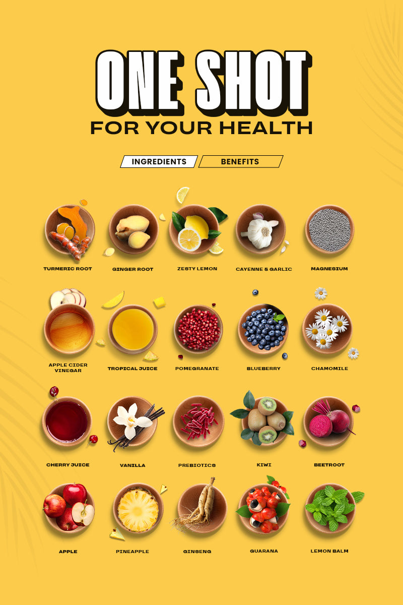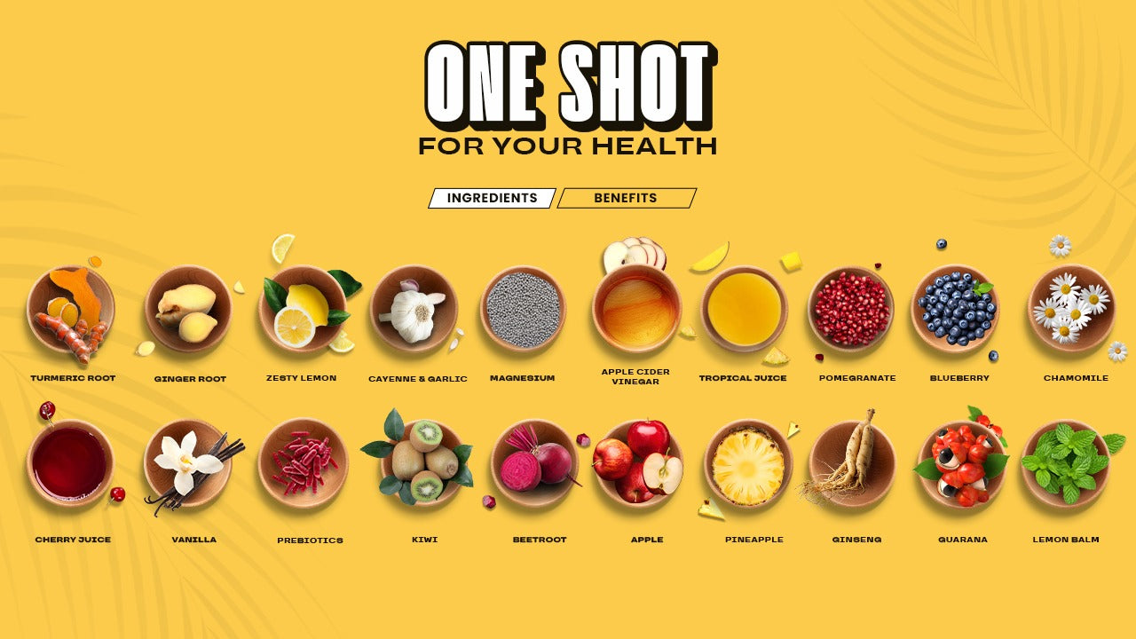 Apple Cider Vinegar, Turmeric, Ginger, Lemon, Cayenne, Garlic, Filtered Water, Magnesium, B Vitamins, Pineapple, Lime, Triple Citrus, Manuka Honey, Zinc, Vitamin C, Vitamin D, Chai Spice, Chilli, Charcoal, Matcha, Pink Sea Salt, Dandelion Root, Collagen Peptides, Cherry Juice, Vanilla, Probiotic, Supergreens, Kiwi, Essential Amino Acids, Beetroot, Apple, Zesty Lemon, Ginseng, Guarana, L-Theanine, Tropical Juice (Pineapple, Mango, Orange), Pomegranate, Blueberry, Chamomile, and Lemon Balm.